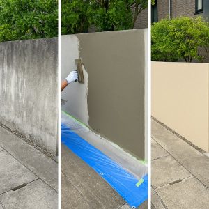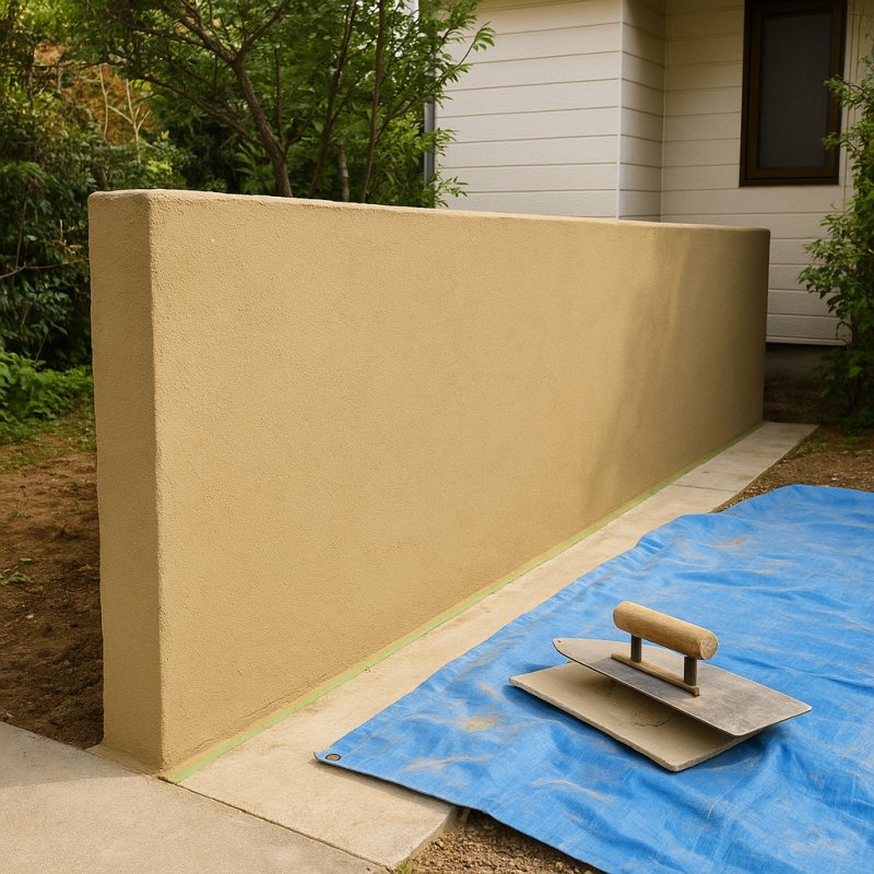 経年劣化で汚れやひび割れが目立っていた外構フェンスを、左官仕上げで再生しました。落ち着いた色調の仕上げにより住宅全体の印象が明るくなり、耐候性も向上しました。左官材料の特性を活かし、手仕事ならではの温かみある外観を実現しました。