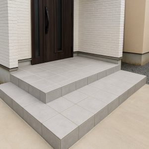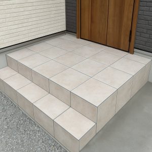 まず既存タイルを撤去し、下地の状態を確認。吸水性の高いモルタル層には部分的な劣化が見られたため、下地補修を行ったうえで、新たに滑りにくさに配慮した外部床用タイルを施工しています。タイルは動線を考慮した300角を基調とし、段差部分には段鼻役物を使用することで、見た目と安全性の両立を図りました。